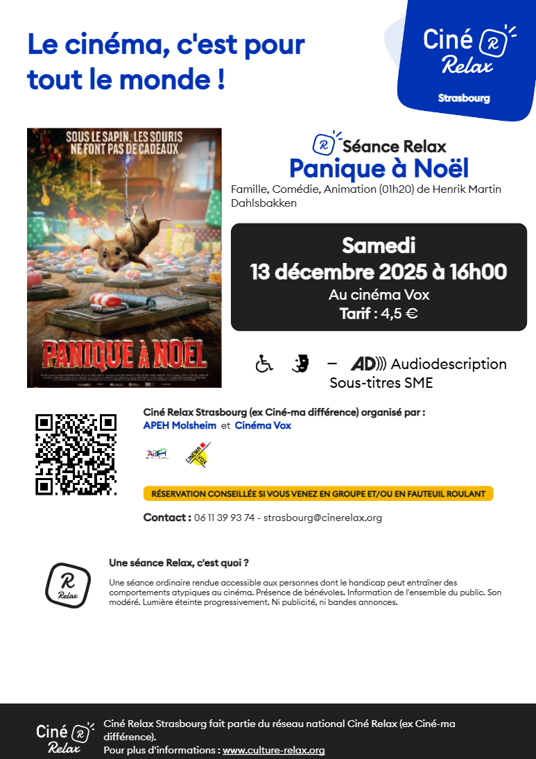 By admin_apeh Actualites Non classé 7 octobre 2021 Ciné Relax Le samedi 13 décembre 2025 à 16.00h le film: « Panique à Noël » - A Strasbourg au cinéma VOX. Une ... Read More
